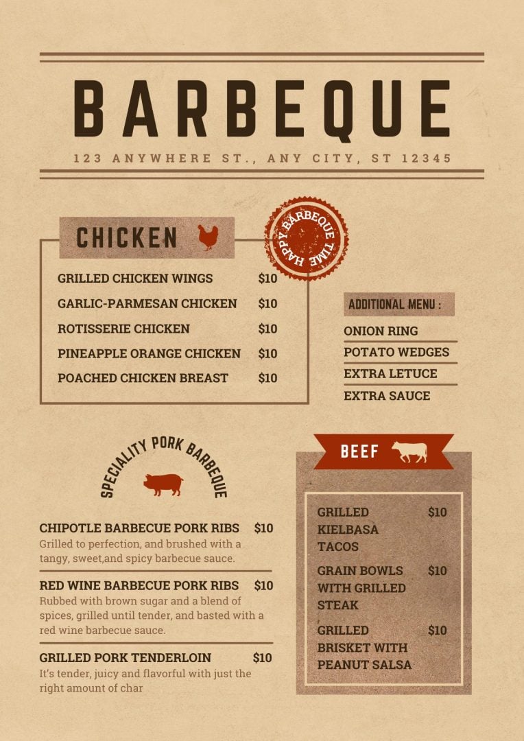 Ignite the flavors of your catering company or service with a barbecue-themed menu item that promises a smoky, savory, and unforgettable experience. Perfect for outdoor events, family gatherings, or any laid-back occasion, this template is your key to a laid-back, finger-licking good time.